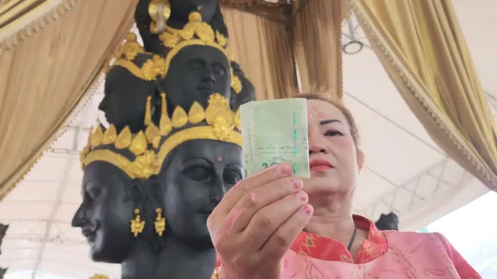นางสุนีย์ ยังเผยอีกว่า เมื่อช่วงงานปิดทองเดือนมกราคมที่ผ่านมา หลวงพ่อแป๊ะได้เปิดลงยันต์หลังฝ่ามือ แต่ต้องผิดหวัง เพราะคนเยอะมาก และยังใหม่อยู่ไม่รู้ว่าดีหรือไม่ เลยรอไม่ไหวกลับบ้านจนกระทั่งแม่ค้าหลายคนมาบอกว่าลงแล้วดีจริง วันนี้เลยตั้งใจมาลงโดยเฉพาะ หลังเสร็จสิ้นจากการลงอักขระยันต์หลังฝ่ามือแล้วได้เดินมาขอพรกับพระตรีมูรติความก้าวหน้า โดยจุดเทียนเดินวนรอบองค์ท่านจำนวน 3 รอบ เสร็จแล้วยังได้แลกธนบัตรเงินขวัญถุงกลับบ้านเพื่อความเป็นสิริมงคลในครั้งนี้ และจะนำ เลขเด็ดงวดนี้ เลขท้ายแบงก์ไปเสี่ยงโชคด้วยพร้อมกับโชว์ธนบัตรที่แลกมา เลขเงินขวัญถุง พระตรีมูรติ ได้หมายเลข 6 D 8 8 9 6 5 9 2